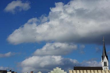 Keywords: sky gulls birds bird roofs steeple church blue clouds bell tower