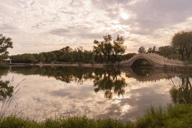 Keywords: sky lake bridge water landscape nature tree scenery outdoors environment reflection grass park