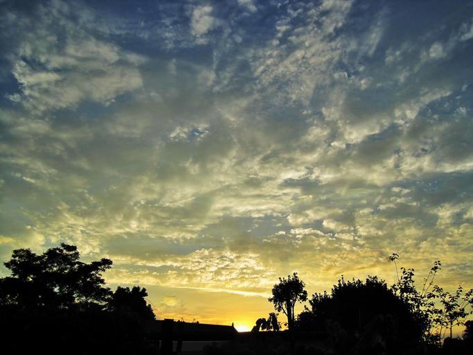 Keywords: sky sunset glow clouds spread white golden radiating trees
