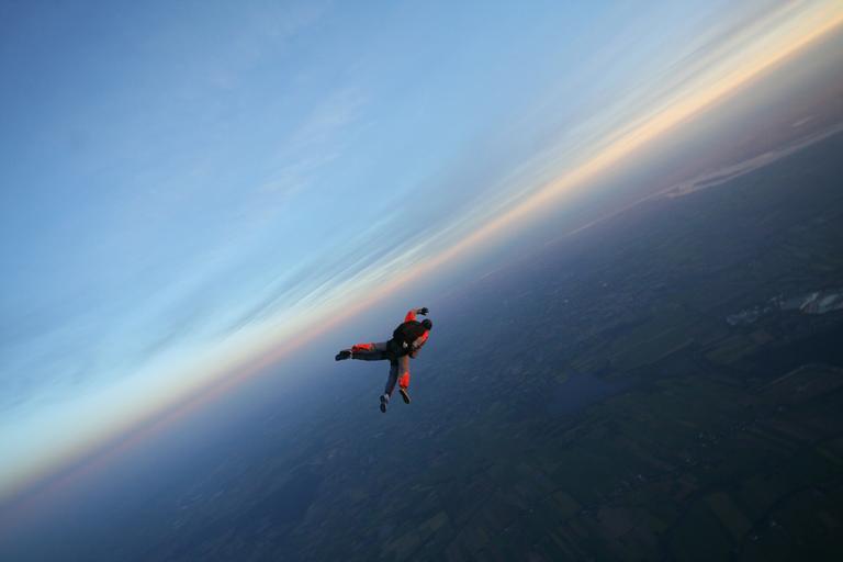 Keywords: skydive sky float fly sport tandem jump hobby distant view air high adrenaline
