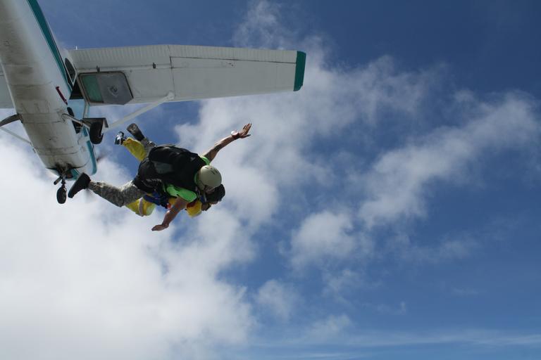 Keywords: diving sky sport extreme parachuting parachute jumping up men parachutist people person background speed all helmet blue fly fun sign adult right male flyer ok portrait young stylish skills skydiving freedom