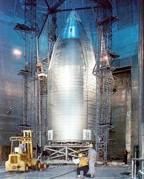 | Keywords: Skylab Shroud installed in the NASA Lewis Research Center's (now known as the Glenn Research Center) Plum Brook Station, Space Power Facility. The shroud protected the upper section of the Skylab space station, including its solar power arrays. When it was constructed, the Space Power Facility (SPF) was the world's largest vacuum chamber. It stands more than 122 feet high, 100 feet in diameter and provides a vacuum environment for the study of space propulsion. Originally commissioned for nuclear-electric propulsion studies, the SPF has been recommissioned for current and future use in the ongoing research and development of space propulsion systems.