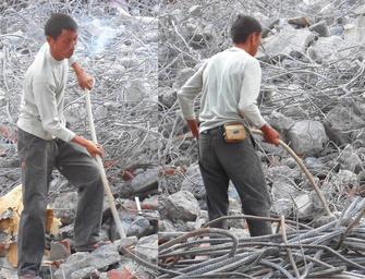| Keywords: Sledgehammer with very flexible handle - 02.jpg en Worker using a sledgehammer to extract rebar and other metal from concrete rubble at building demolition site Haikou City Hainan Province China 2012-04-28 own Anna Frodesiak cc-zero Uploaded with UploadWizard Rebar Sledgehammers Files by User Anna Frodesiak Rubble |