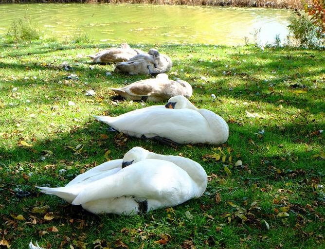 Keywords: sleeping swans young signets river bank wild birds canada autumn nature