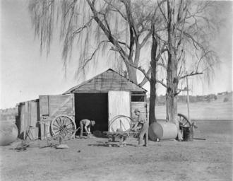 View Original:SLNSW 10658 Wheelwrights working on a wagon wheel at Jindabyne.jpg (1400x1088)
