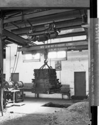 View Original:SLNSW 13043 Workshop scene showing two ton electric hoist doing a lift Wartime sign Dont help the black market.jpg (830x1050)