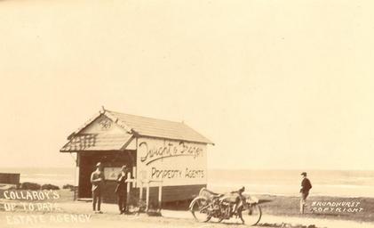| Keywords: SLNSW 796225 Collaroys Up to Date Estate Agency Dwight amp Frazer Property Agents.jpg Photographs 1073 postcards silver gelatin photoprints b w and hand col ; 8 8 x 14 cm -14 x 8 8 cm ; Ephemera 1 pamphlet William Henry Broadhurst was born at Maitland on 13th August 1855; he died aged 72 on 29 July 1927 He moved to Ashfield Sydney and began employment as a surveyor's assistant working mainly on the south coast of NSW He turned his interest in photography into a business and from around 1900 began to publish postcards Many of the photographs were hand coloured for sale by his daughters To secure his photographs he travelled by train and then walked wherever he wanted to go -- Reference source Illawarra Historical Society Bulletin September 1970 pp 2-3 PXA 635/1071 Presented 1970; Pic Acc 2048 For access to this material please contact the Head of Pictures Section - M A B often appears on the front of Broadhurst postcards The name M Broadhurst also appears on the back of some postcards eg PXA 635/179 The identity and significance of this anomaly is unknown This collection has been arranged by geographical location You may navigate from this collection record to these individual records 796225 Collaroy's Up to Date Estate Agency Dwight Frazer Property Agents Postcards of New South Wales Collaroy New South Wales |