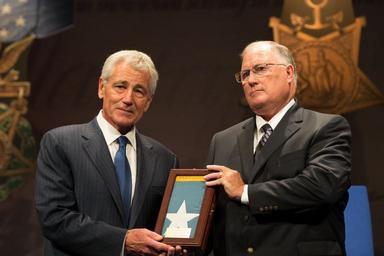 | Keywords: Sloat Medal of Honor 140916-N-AF077-082.jpg en Secretary of Defense Chuck Hagel left gives William Sloat the brother of Medal of Honor recipient U S Army Spc 4 Donald P Sloat a Medal of Honor flag after inducting his brother into the Hall of Heroes during a ceremony at the Pentagon in Arlington Va Sept 16 2014 Sloat was posthumously awarded the Medal of Honor Sept 15 2014 for actions during a combat patrol near Hawk Hill Fire Base South Vietnam Jan 17 1970 Sloat was assigned to Delta Company 2nd Battalion 1st Infantry Regiment 196th Light Infantry Brigade 23rd Infantry Americal Division DoD photo by Mass Communication Specialist 2nd Class Sean Hurt U S Navy/Released 2014-09-16 Sean Hurt https //www dvidshub net/image/1580429 140916-N-AF077-082 2014-09-29 16 27 ARLINGTON VA US PD-USGov-Military-Navy Chuck Hagel Images from DoD uploaded by Fæ |