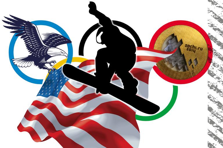 Keywords: slopestyle gold medal sochi 2014 russia olympiad winter olympics competition snwowboarder freestyle jump olympic rings grunge flag usa white tailed eagle star