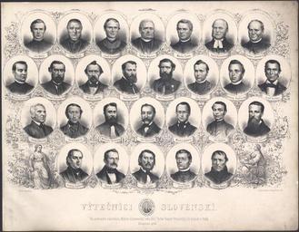 | Keywords: Slovak Celebrities 1863.jpg LargeImage Gallery of famous Slovak people active in different areas history literature education religion science Published on occasion of establishing Matica slovenská Slovak Foundation major patriotic organization List of portraited personalities Ján Mallý-Dusarov Juraj Tvrdý Jozef Kozáček Štefan Moyzes Martin Čulen Karol Kuzmány Štefan Závodník Michal Chrástek Viliam Pauliny-Tóth Michal Miloslav Hodža Štefan Marko Daxner Ján Francisci-Rimavský Ján Gotčár Andrej Ľudovít Radlinský Jozef Miloslav Hurban Jonáš Záborský Jozef Karol Viktorin Mikuláš Štefan Ferienčík Ján Kalinčiak Martin Hattala Ján Palárik František Víťazoslav Sasinek Andrej Sládkovič Daniel Gabriel Lichard Ján Čipka Juraj Slota Andrej Kossa http //kramerius nkp cz/kramerius/handle/ABA001/10842301 Výtečníci slovenskí digitized by National Library in Prague 1863 Josef Rupert Maria Přecechtěl 1821 - 1897 Lithography probably by Roland Weibezahl 1817-1871 signed on http //kramerius nkp cz/kramerius/handle/ABA001/10890056 sheet 2 of the same series bottom left so swnd PD-old Matica slovenská Josef Rupert Maria Přecechtěl People of Slovakia Štefan Moyzes |