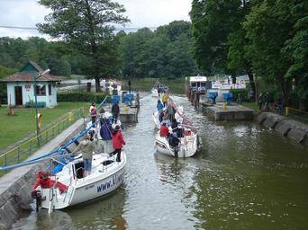 Keywords: Sluza Guzanka.13.jpg pl Śluza Guzianka Jachty opuszczają śluzę z prawej strony widoczne jednostki przygotowywujące się do wpłynięcia own Duży Bartek 2009-06-13 Śluza Guzianka