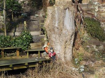 Keywords: small figure wooden figure painted wooden figure oliver hardy laurel and hardy figure tree stump moat