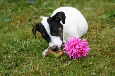 Keywords: small havko terrier pulp dog pet grass outdoors flower eat pear funny