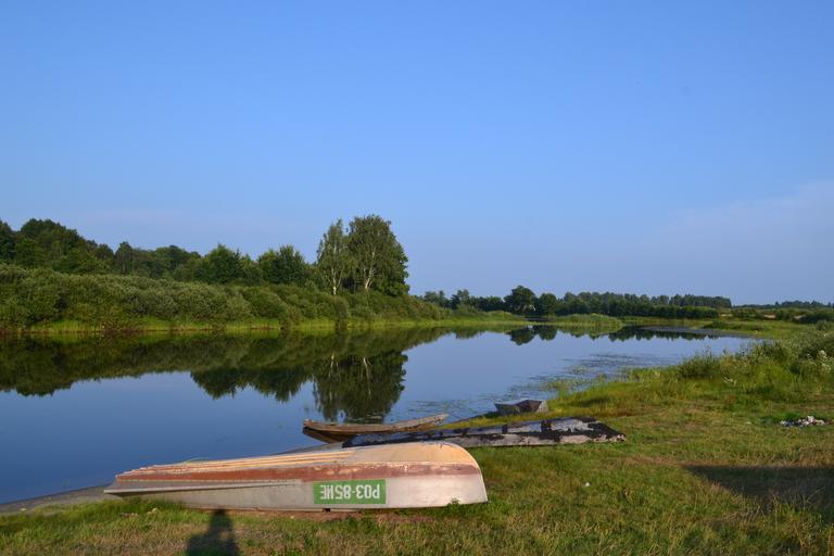 Keywords: small river summer reflection in the water quiet river nature fishing boat beauty