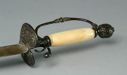 | Keywords: Smallsword handle steel ivory.jpg Small Sword<br/> c 1750 1770<br/> This small sword was carried by Capt John Paul Schott in the American Revolution <br/> Steel ivory L 85 3 cm<br/> Morristown National Historic Park MORR 175 From http //www cr nps gov/museum/exhibits/revwar/image_gal/morrimg/swordivory html www cr nps gov PD-USGov Smallswords Sword hilts |