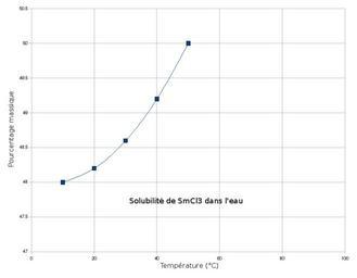 | Keywords: SmCl3 Solubilite dans eau.png fr Solubilité de SmCl3 dans l'eau en fonction de la température Créée par mes soins avec OpenOffice org Calc et The Gimp d'après http //www hbcpnetbase com/ Handbook of Chemistry Physics Epop Check categories 2009 May 2 fr wikipedia Trichlorure_de_samarium Chemistry 2 Samarium III chloride |
