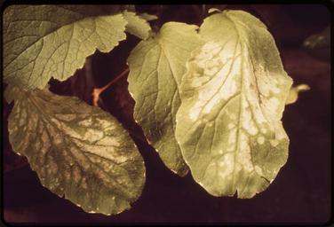 | Keywords: SMOG-DAMAGED PLANT AT THE STATEWIDE AIR POLLUTION RESEARCH CENTER, UNIVERSITY OF CALIFORNIA. PLANT WAS DAMAGED BY... - NARA - 542686.jpg Scope and content General notes 542686 Local identifier 412-DA-193 Environmental Protection Agency 12/02/1970 - NARA-Author Daniels Gene photographer Photographer 8463941 <br /> Riverside Riverside county California United States North and Central America inhabited place 4204330 33 95 -117 38 <br /> Still Picture Records Section Special Media Archives Services Division NWCS-S National Archives at College Park 8601 Adelphi Road College Park MD 20740-6001 05/1972 Record group Record Group 412 Records of the Environmental Protection Agency 1944 - 2006 Record group ARC 708 DOCUMERICA The Environmental Protection Agency's Program to Photographically Document Subjects of Environmental Concern compiled 1972 - 1977 Series ARC 542493 File unit File unit ARC Variant control numbers Agency-Assigned Identifier 004/13/000000<br /> NAIL Control Number NWDNS-412-DA-193 Other versions <gallery> File SMOG-DAMAGED_PLANT_AT_THE_STATEWIDE_AIR_POLLUTION_RESEARCH_CENTER _UNIVERSITY_OF_CALIFORNIA _PLANT_WAS_DAMAGED_BY _-_NARA_-_542686 tif tif File SMOG-DAMAGED_PLANT_AT_THE_STATEWIDE_AIR_POLLUTION_RESEARCH_CENTER _UNIVERSITY_OF_CALIFORNIA _PLANT_WAS_DAMAGED_BY _-_NARA_-_542686 jpg jpg </gallery> NARA-cooperation PD-USGov Smog in the United States US National Archives series DOCUMERICA The Environmental Protection Agency's Program to Photographically Document Subjects of Environmental Concern compiled 1972 - 1977 Unidentified plants in the United States Diseases and disorders of leaves due to pollution |