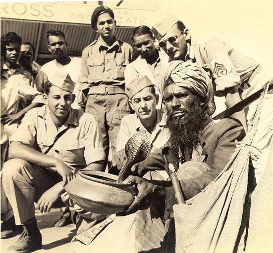 Keywords: Snake charmer with hooded cobra in Calcutta in 1945.jpg A group of GI's take a close look at the snake-wallah's hooded cobra Both the snake and his master are good specimens The fangs of course have been removed so the reptile can strike at will scaring no one The South Asia Section of the Van Pelt Library University of Pennsylvania recently acquired from a bookdealer a photograph album consisting of 60 photographs of Calcutta taken most likely between 1945-1946 The photographer Mr Clyde Waddell also provided the interesting glosses accompanying each photograph Several attested copies of this work has emerged including one with a 'title page' held by the Southeastern Louisiana University in Hammond Louisiana Mr Waddell was a military photographer Many of his captions sound like annotations that would be found in a typical military magazine The album begins with several general long shots of Calcutta and ends with a picture of dhobi-s washermen washing clothes The text accompanying the last photograph also sounds as if the author intended to finish with that picture of one of the great mysteries of India The annotations have been included because of their intrinsic interest not only to the photographs but to a 'typical' American impression of India at this time 1945 http //www library upenn edu/collections/sasia/calcutta1947/ Clyde Waddell other versions PD-USGov Van Pelt Library University of Pennsylvania - Clyde Waddell Calcutta 1940's photos Uploaded with UploadWizard Snake charmers in India Naja |