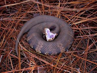 Keywords: snake water moccasin viper crocs mouth aggressive semiaquatic viper agkistrodon piscivorus the viperidae family painful bite sometimes fatal southeast of the united states usa animal animals rempant straw wallpaper background