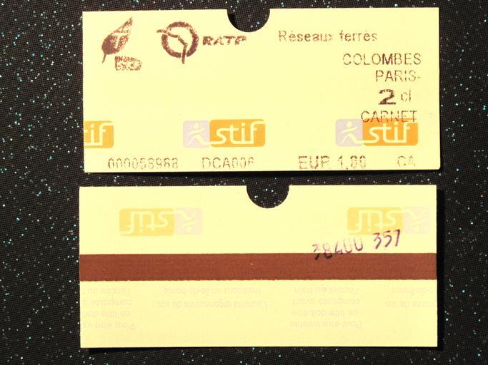 Keywords: SNCF Paris suburb ticket.jpg en Recto and verso of a SNCF ticket for train in the suburb of Paris The printed numbers are 38400 the code for the train station gare Saint-Lazare where the ticket was punched and 357 the number of the day in the year déc-23 fr Recto et verso de ticket SNCF en banlieue parisienne Dans les chiffres compostés 38400 est le code de la gare Saint-Lazare où le billet a été composté et 357 le numéro du jour de l'année 23 déc own Tangopaso 2009-12-23 Commons Tangopaso Rail tickets of Île-de-France |