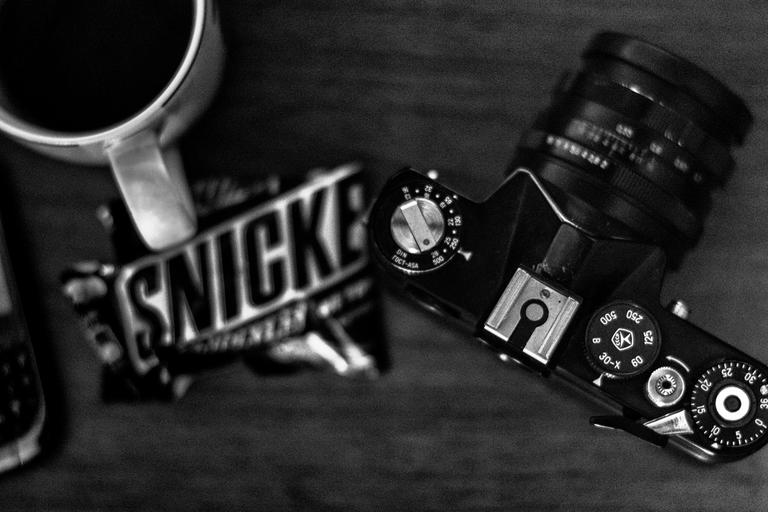 Keywords: snickers photo camera cup still life style lifestyle black and white old camera lens coffee chocolate group
