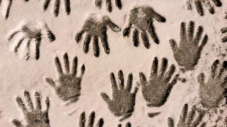 Keywords: snow hands winter children season imprint shape fingers fun