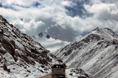 Keywords: snow road mountains sky clouds winter car snow peak