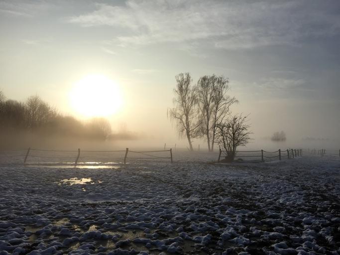 Keywords: snow winter land landscape morgenstimmung fog sun pale light sky rest tree nature mood atmosphere idyll reported inner calm cloud wide silent
