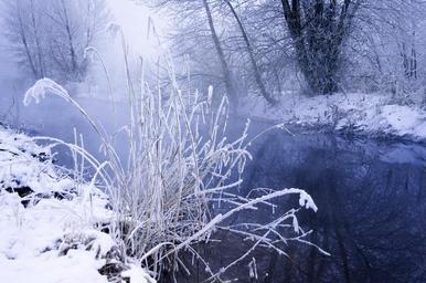 Keywords: snow winter landscape branches grass fog river water frost