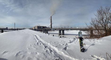 Keywords: snowboard city winter snow landscape sky bridge trees