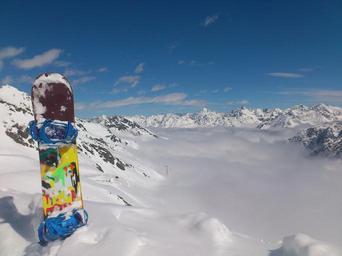 Keywords: snowboard winter winter sports sölden glacier tiefenbach glacier ski mountain alpine austria summit mountains clouds top landscape sky sun freedom wide burton lipstick
