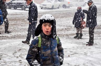 Keywords: snowfall snowing boy candy sweet cold winter snowflake white hat snow cover school boy mongolia