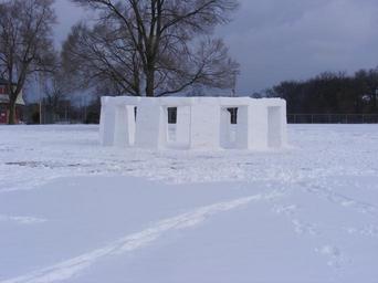 | Keywords: Snowhenge2.JPG en A 1/3rd scale replica of Stonehenge at the MacKay Jaycees Family Park in Grand Rapids Michigan The monument built out of Michigan's most abundant natural raw material is appropriately named Snowhenge Standing 6 5 feet tall and 30 feet in diameter and consisting of nearly 1000 cubic feet of packed snow Snowhenge's 12 pillars and 12 lintels are perfectly aligned astronomical markers Looking directly through the hole in the center of pillar 3 soon after sunset on Winter Solstice extraordinarily reveals an almost equilateral triangle formed by the visible planets Saturn left Mars top and Venus right A curious carving on pillar 4 shows four stars inside a trapezium which matches the Trapezium Star Cluster in the Orion Nebula The imaginary end point of a line dissecting the trapezium matches the coordinates of the star Sirius the brightest star in the Milky Way An obelisk inside the snow circle marks the passage of the sun as its shadow moves in a figure eight on the ground below Stone plaques strategically placed on the ground display the constellations of the zodiac Outside the circle three pairs of standing snowmen show where the sun rises and sets for each of the solstices and equinoxes Every key point also has a rock plaque denoting its seasonal significance engraved with a simple phrase like Midsummer Solstice Sunrise Others describe local area seasonal events such as Blandford Sugarbush Grand Rapids Festival of the Arts 28th Street Metro Cruise and Celebration on the Grand The 12 lintels supported by 144 rods of ice rebar also contain markings that coincide with the orbital patterns of Earth and Venus which are designed to forecast solar eclipses the appearance of comets and the end of the world on December 23rd of 2012 exactly matching the Mayan calendar prediction What's most truly remarkable pillar 1 is precisely parallel with 28th Street Curiously the phenomenon known as global warming which has created isolated heat zones around the globe inversely causes cold spots on the opposite side of the globe Numerous consecutive years of record heat spikes in Perth Australia are directly responsible for the extraordinary cold snaps at MacKay Jaycees Family Park which will amazingly keep Snowhenge frozen all year round http //snowhenge blogspot com Stonehenge Mystery Solved at Snowhenge - Michigan DRUIDS Unravel the Ancient Enigma own MichiganArchaeologist 2010-02-13 Replicas of Stonehenge Parks in Michigan Snow in the United States |