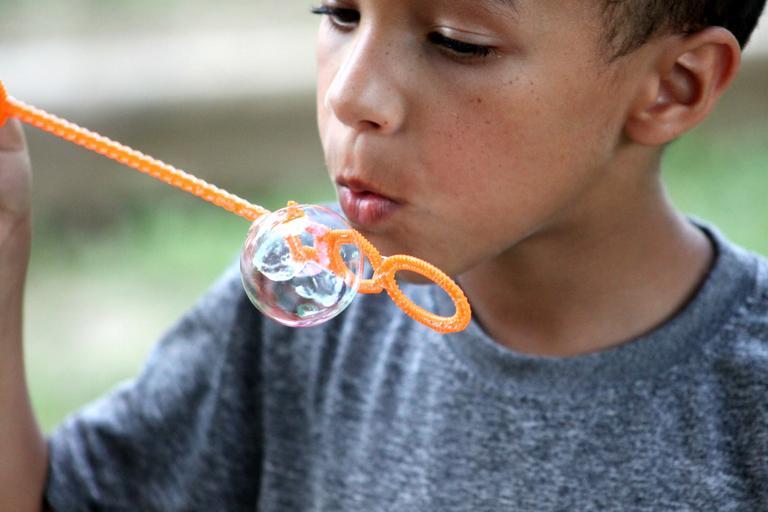 Keywords: soap bubble boy blowing bubbles happy young child childhood summer face