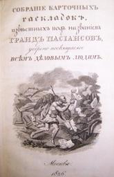 | Keywords: Sobranie kartochnyh raskladok.jpg en Cover page of book Sobranie kartochnyh raskladok Moscow 1826 ru Титульный лист книги Соб ание ка точных аскладок 1826 http //www bukinist23 ru/catalog/ action item id 821 author 1826 PD-old Title pages from Russia Solitaire 1826 books |