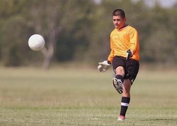 Keywords: soccer football player kicking kick ball sport game field grass competition boy summer active action male play competitor playing outdoor athlete athletic outside