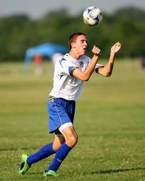 Keywords: soccer football sport game competition action ball player field grass summer green active focus concentration outdoor athlete athletics focusing head male determination