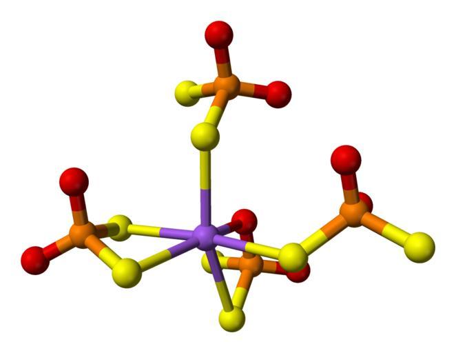 Keywords: Sodium-dithiophosphate-xtal-Na(1)-coordination-3D-balls.png Ball-and-stick model of the coordination of the sodium ion Na 1 in the crystal structure of sodium dithiophosphate Na<sub>3</sub>PO<sub>2</sub>S<sub>2</sub> X-ray crystallographic data from http //dx doi org/10 1016/j solidstatesciences 2003 07 002 Solid State Sciences 2003 5 1439-1444 Model constructed in http //www crystalmaker com/ CrystalMaker 8 1 Image generated in http //accelrys com/products/discovery-studio/visualization/discovery-studio-visualizer html Accelrys DS Visualizer Own 2009-03-26 Ben Mills Benjah-bmm27 Images by Ben Mills Sodium dithiophosphate |