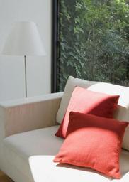 Keywords: white carpet couch sofa leather red pillow modern room nobody copy dwelling contemporary light concrete cozy wall furniture interior settee inside home house stylish background space residence comfortable indoors