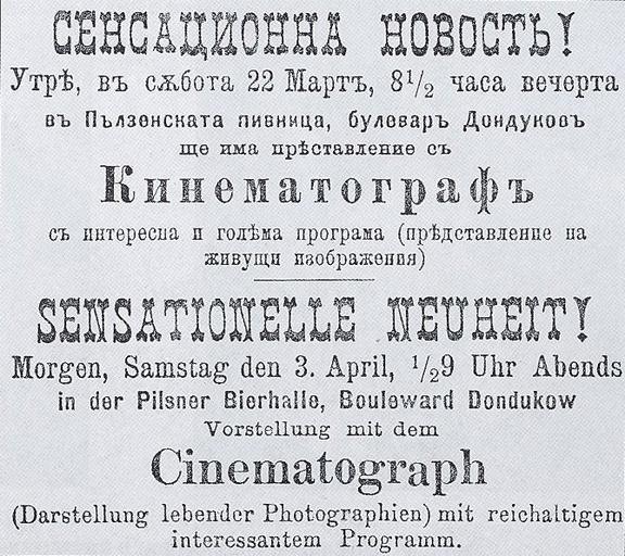 Keywords: Sofia movie 1897.jpg Announcement for the first movie shown in Sofia Bulgaria Ки аджиев Светлин 2006 София 125 години столица 1879-2004 година ИК Гутенбе г ISBN 978-954-617-011-8 1897 author Anonymous-EU History of Sofia 22 March Cyrillic writing 1897 in Sofia Cinematography Cinemas in Sofia |