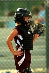 Keywords: softball player catcher girl female game competition play athlete sport uniform glove young helmet catcher's mask catcher's mitt