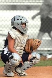Keywords: softball player catcher sport game glove catcher's mitt catcher's mask protection shin guards action signal pitch dirt home plate focus concentration helmet girl competition competitive american