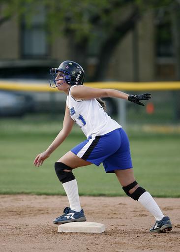 Keywords: softball runner player female game sport base field athletic dirt youth girl play helmet teen activity action uniform anticipation watching concentration focus skill