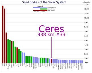 | Keywords: Solar-system-top45-solid-body-diameter-Ceres.svg en A bar chart of the largest by diameter solid bodies in the Solar system that is excluding the sun and giant planets in order highlighting Ceres own Tbayboy 2015-06-19 Solar System object comparisons SVG Astronomy Cc-zero |