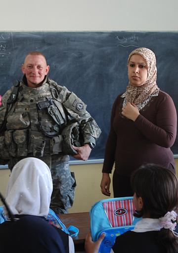 | Keywords: Soldiers Help Celebrate Sadr City School Renovation DVIDS62572.jpg en Willard Ohio native Lt Col Dan Barnett commander of the 1st Squadron 2nd Stryker Cavalry Regiment currently attached to 2nd Brigade Combat Team 82nd Airborne Division talks with one of the teachers at the Yarmook Girl's School in Baghdad's Sadr City neighborhood during a visit to the school to see improvements made during a recent renovation effort sponsored by the Iraqi government the INP and the U S military The students all received free backpacks during the visit 2007-10-24 Staff Sgt Michael Pryor https //www dvidshub net/image/62572 62572 2007-10-24 12 50 BAGHDAD IQ PD-USGov 82nd Airborne Division Images from DoD uploaded by Fæ |