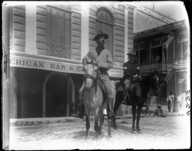 | Keywords: botany expedition botanyexpedition 1898 1899 charles millspaugh charlesmillspaugh edward allen edwardallen edward isham jr. edwardishamjr jordan mott jr. jordanmottjr bermuda bahamas haiti jamaica puerto rico cuba yucatan central america centralamerica west indies westindies plant collecting plantcollecting blackandwhite monochrome sport riding black and white Soldiers on horses outside American Bar and Cafe. 1899. Name of Expedition: Allison V. Armour Expedition Participants: Charles F. Millspaugh, Edward P. Allen, Edward S. Isham Jr.,Jordan L. Mott Jr. Expedition Start Date: December 21, 1898 Expedition End Date: March 11, 1899 Purpose and Aims: Plant collecting and photography for Botany in the Bermuda, Bahamas, Haiti, Jamaica, Puerto Rico, Cuba, Yucatan. Vessel Name: Utowana (Yacht, Sailboat) Location: Central America Original material: 4x5 inch glass negative Digital Identifier: CSB4239 Learn more about The Field Museum's Library Photo Archives. Soldiers on horses outside American Bar and Cafe. 1899. Name of Expedition: Allison V. Armour Expedition Participants: Charles F. Millspaugh, Edward P. Allen, Edward S. Isham Jr.,Jordan L. Mott Jr. Expedition Start Date: December 21, 1898 Expedition End Date: March 11, 1899 Purpose and Aims: Plant collecting and photography for Botany in the Bermuda, Bahamas, Haiti, Jamaica, Puerto Rico, Cuba, Yucatan. Vessel Name: Utowana (Yacht, Sailboat) Location: Central America Original material: 4x5 inch glass negative Digital Identifier: CSB4239 Learn more about The Field Museum's Library Photo Archives. |