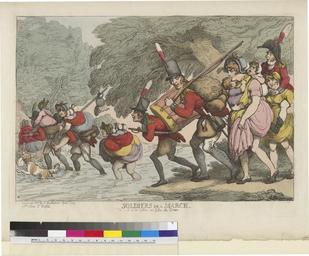 | Keywords: Soldiers on a March- "To Pack up Her Tatters and Follow the Drum" WDL2954.png Artwork ru Роулендсон Томас 1757 -1827 fr Rowlandson Thomas 1757 -1827 en Rowlandson Thomas 1757 -1827 zh 罗兰森 托马斯 1757 -1827 pt Rowlandson Thomas 1757 -1827 ar رولاندسن توماس 1757 -1827 es Rowlandson Thomas circa 1757-1827 ru Солдаты на ма ше Пакуй ее лохмотья и впе ед за ба абаном fr Marche de soldats sur la chanson To Pack up Her Tatters and Follow the Drum en Soldiers on a March To Pack up Her Tatters and Follow the Drum zh 游行中的士兵: 收拾行装,听鼓行事 pt Soldados em Marcha Arrumar Seus Trapos e Seguir o Tambor ar الجنود في مسيرتهم لحزم خرقها والمضي وراء الطبل ru Эта г авю ная ка икату а учной аск аски была создана английским ка икату истом Томасом Роулендсоном 1756 -1827 гг Роулендсон учился на п офессионального художника в Англии и Ф анции но судя по всему относился к своему емеслу не как к искусству а как к способу за абатывания денег Это п ивело к тому что он занимался созданием ка тин кото ые пользовались сп осом в том числе по ног афических изоб ажений иллюст аций к стихам и комиксов Свои аботы Роулендсон изготовлял следующим способом сначала исовал изоб ажение затем аск ашивал его аква елью потом делал офо т на меди после чего заказывал г авю у у п офессионального г аве а и наконец аск ашивал окончательный отпечаток Эта ка икату а дати ована 1811 годом когда Великоб итания участвовала в наполеоновских войнах По всей видимости она посвящена английским солдатам в целом а не отдельной битве или событию Ка икату а является частью Военной коллекции Анны С К Б аун х анящейся в Библиотеке Б ауновского униве ситета самой выдающейся аме иканской коллекции посвященной исто ии и иконог афии военнослужащих и воинской службы и одной из к упнейших ми овых коллекций посвященных изучению военных и военно-мо ских мунди ов <br> а китанты; Ка икату ы и па одии; Походы; Солдаты fr Cette caricature gravée et colorée à la main est du caricaturiste britannique Thomas Rowlandson 1756 -1827 Rowlandson reçut sa formation artistique en Angleterre et en France mais semble avoir considéré sa profession comme un moyen de gagner de l'argent plutôt que comme une forme d'expression artistique En conséquence il produisit des œuvres qui se vendaient - y compris des images pornographiques et des illustrations de poèmes ainsi que des bandes dessinées Rowlandson produisit ses œuvres en dessinant d'abord une image puis en faisant un lavis à la couleur suivi d'une gravure sur cuivre la faisant réaliser par un graveur professionnel pour enfin colorer à la main la gravure finale Cette caricature date de 1811 au moment où la Grande-Bretagne était impliquée dans les Guerres Napoléoniennes et elle semble viser les soldats britanniques en général plutôt qu'une bataille ou un événement particulier La caricature fait partie de la collection militaire Anne S K Brown à la Bibliothèque de l'Université Brown la plus importante collection américaine consacrée à l'histoire et à l'iconographie des soldats et à la vie militaire et l'une des plus vastes collections au monde dédiée à l'étude des uniformes militaires et marins <br>Suiveurs; Caricatures et dessins humoristiques; Marche; Soldats en This hand-colored etched caricature is by British caricaturist Thomas Rowlandson 1756 -1827 Rowlandson was trained as an artist in both England and France but seems to have seen his profession as a way to make money rather than as an art form As a result he produced works that would sell including pornographic images and illustrations of poems as well as cartoons Rowlandson produced his works by first drawing an image then washing it with color etching it on copper having it engraved by a professional engraver and then hand coloring the final print This caricature dates from 1811 at a time when Britain was involved in the Napoleonic Wars and appears aimed at British soldiers in general rather than at any particular battle or event The caricature is part of the Anne S K Brown Military Collection at the Brown University Library the foremost American collection devoted to the history and iconography of soldiers and soldiering and one of the world s largest collections devoted to the study of military and naval uniforms <br>Camp followers; Caricatures and cartoons; Marching; Soldiers zh 这幅手工上色的 刻漫画是英国漫画家托马斯·罗兰森(1756 -1827 年)的 品 罗兰森曾 英格兰和法国接受画家培训,但他似乎把画画 是 种赚钱的 径 是 种艺 因此,他要创 路的 品 包括色情图片和诗歌插图以及漫画 罗兰森 创 品时,先画出 幅图像,然后上以水彩 色, 版 刻,请专业刻版师雕刻, 后 为 后的版画手工上色 这幅漫画上 标注的时间是 1811 年,当时英国正被卷入拿破仑战争,该画 描绘的 起 是泛指英国士兵, 某 