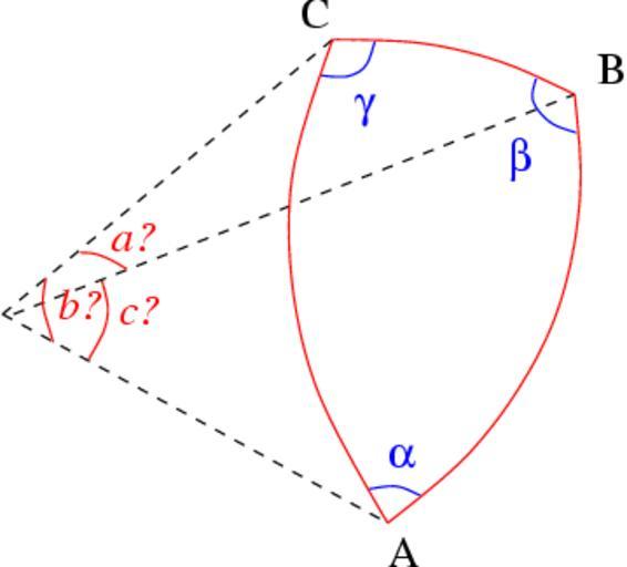 Keywords: Solve spherical triangle with alpha beta gamma.png math en Solving a spherical triangle with these known elements and user Régis Lachaume own Spherical geometry Spherical triangles Solution of triangles
