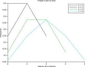 | Keywords: Somme n tirages pile ou face 1 a 4.svg fr Fréquence d'apparition d'une valeur pour la somme de n tirages à pile ou face Illustration du théorème central limite Créé avec Scilab modifié avec Inkscape en Frequency of occurrence of values for the sum of n coin flippings Illustration of the central limit theorem Created with Scilab modified with Inkscape 2013-06-18 11 08 33 own Cdang cdang Scilab source <source lang scilab > // Trace la fonction de densité de la moyenne de n tirages à pile ou face clear; clf; nbmax 4; // nombre max de tirages function frequences tirages n // calcule les fréquences de n tirage à pile ou face par dénombrement // entrées n nombre de tirages entier // sorties frequences matrice de fréquences réels N 2 n; // nombre de valeurs possibles resultats zeros N n ; // initialisation résultats des tirages for i 1 n // n° de colonne k 2 n - i ; //à la colonne i on alterne k valeurs 0 et k valeurs 1 for j 0 2 i - 1 - 1 resultats 2 j k + 1 2 j + 1 k i 0; resultats 2 j + 1 k + 1 2 j + 2 k i 1; end end //disp resultats ; somme sum resultats c ; frequences_non_triees tabul somme ; frequences gsort frequences_non_triees lr i ; frequences 2 frequences 2 /N; // normalisation des fréquences endfunction // Programme principal for i 1 nbmax XY tirages i ; plot2d XY 1 XY 2 style i end axe gca ; xtitle Tirages à pile ou face Valeurs de la somme Fréquence legend n 1 n 2 n 3 n 4 </source> cc-zero Uploaded with UploadWizard Coin flipping Central limit theorem |
