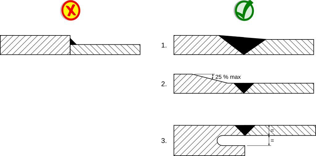| Keywords: Soudage pieces epaisseurs differentes.svg en Welding parts which have different thicknesses left wrong solution; right agood solutions Small difference of thickness Back chamfering with a small angle Relief groove fr Soudage de pièces dépaisseur différente gauche mauvaise solution ; droite bonnes solutions Cas d'une faible différence d'épaisseur Délardage Rainure de décharge 2012-05-09 own + modified versions of File Artículo bueno svg and File Symbol speedy delete vote svg different colours Cdang inkscape cc-zero Uploaded with UploadWizard Welding diagrams |